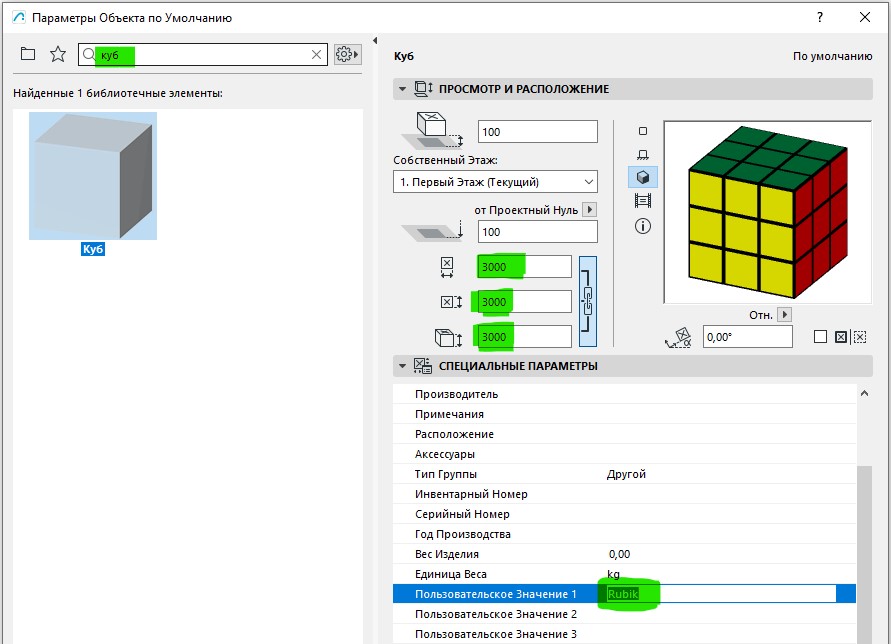 Чтобы поиграть в кубик Рубика в Архикад найдите в библиотеке элемент Куб. Задайте размеры элемента 3000х3000х3000. Затем задайте Пользовательское значение 1: Rubik